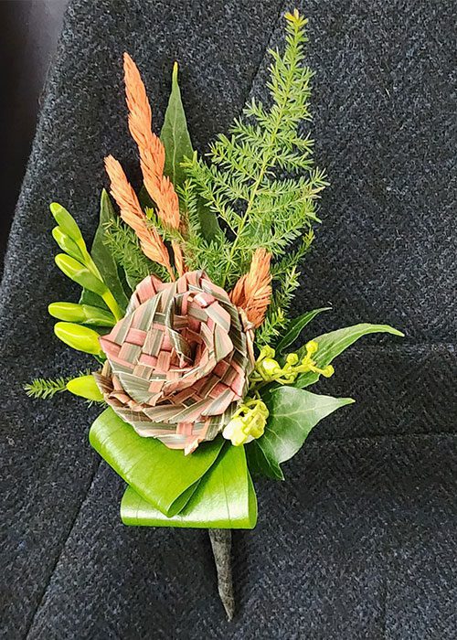 Whero Putiputi Buttonhole – red woven flowers in matching shades of red. This is an awesome combo.
